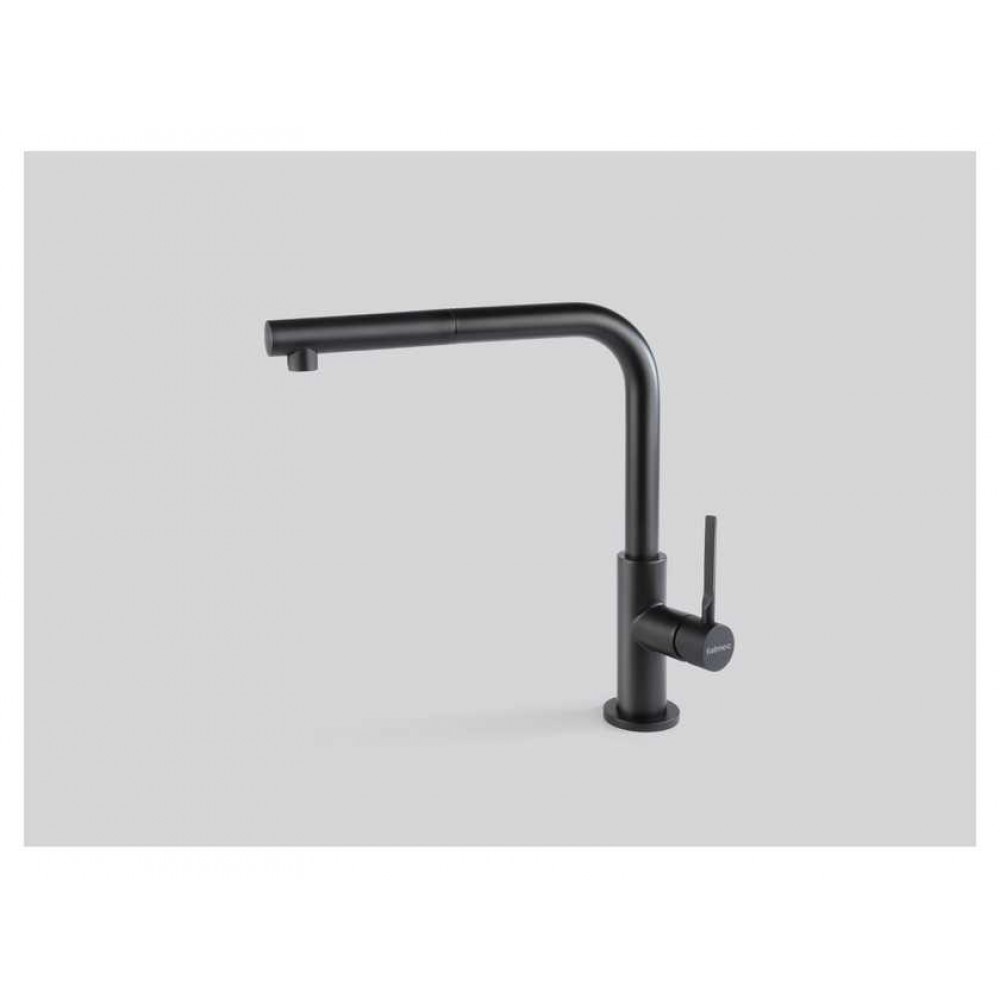 Описание Однорычажный смеситель для мойки с прямоугольным  поворотным изливом и выдвжным душем. Соединительные шланги с внутренней резьбой 3/8 дюйма Отделка черный мат Диаметр выреза 35 мм