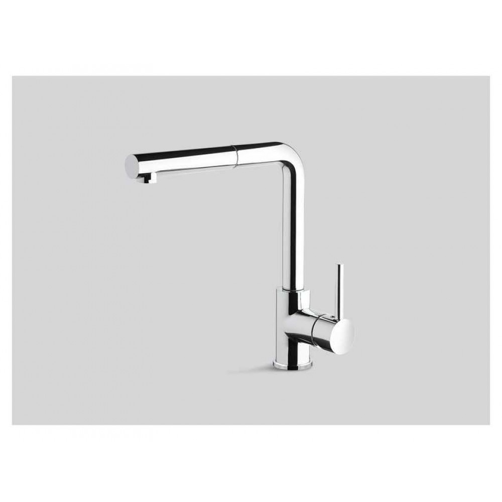 Описание Однорычажный смеситель для мойки с прямоугольным  поворотным изливом и выдвжным душем. Соединительные шланги с внутренней резьбой 3/8 дюйма Отделка хром Диаметр выреза 35 мм