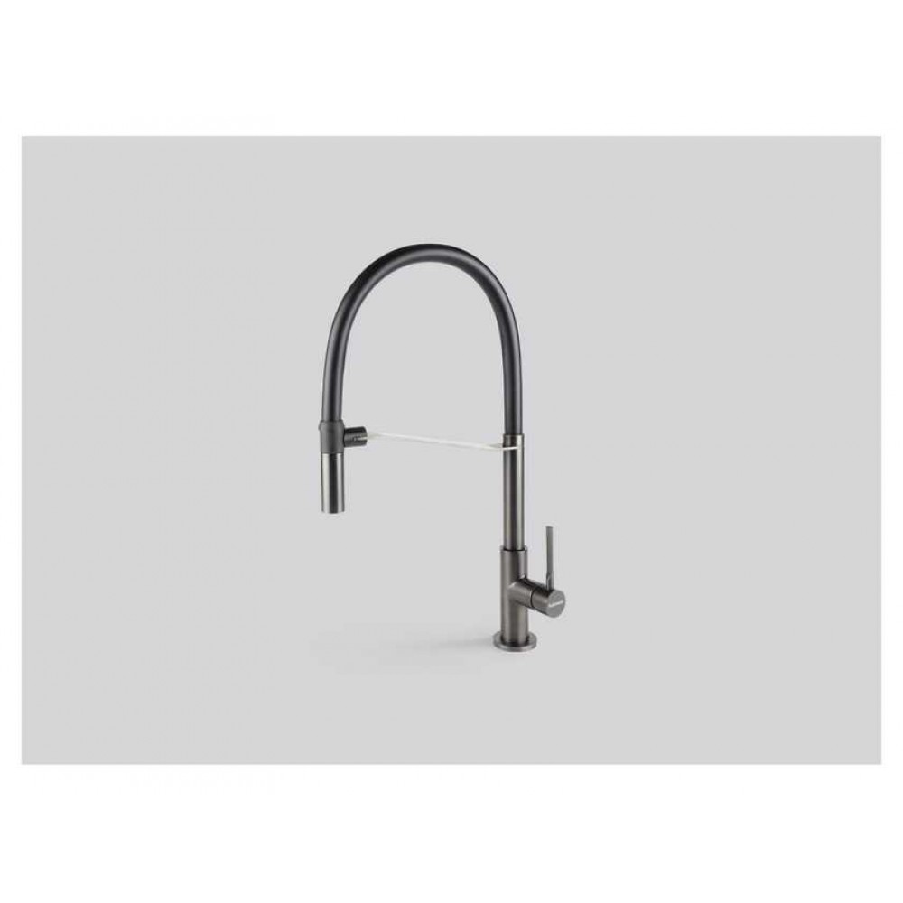 Описание Однорычажный смеситель для мойки с поворотным и регулируемым изливом. Соединительные шланги с внутренней резьбой 3/8 дюйма Отделка вороненая сталь Диаметр выреза 35 мм