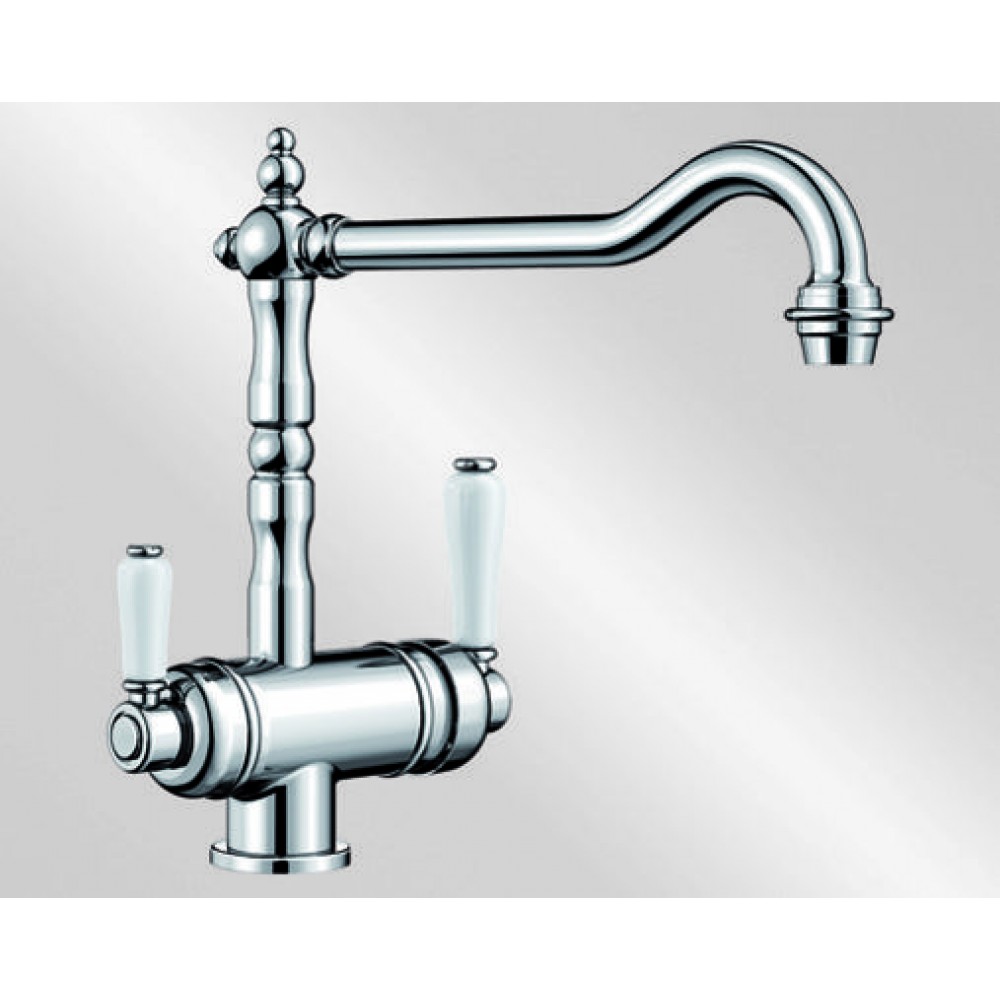 Традиционный внешний вид и современное подключение фильтра • Классический дизайн элементов управления, подключение фильтра • Отдельные рычаги управления для фильтрованной и нефильтрованной воды • Один совмещенный излив для питьевой и обычной воды с разделением рассекателя