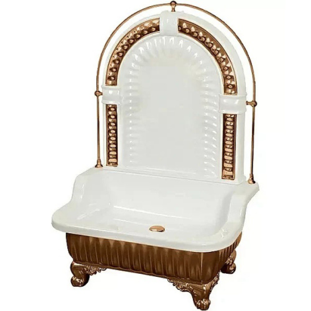 Напольная раковина Migliore Olivia Zampa с галереей в бронзовом цвете — это утончённое сочетание белого и бронзы, идеально подходящее для создания элегантного интерьера. Ножки в форме лап подчеркивают классический дизайн, добавляя изысканности. Раковина и пристенная панель выполнены в гармоничном бело-бронзовом цветовом решении, что придает изделию уникальный стиль. Изготовленная из прочного стеклокомпозита с глянцевой поверхностью, она долговечна и проста в уходе. Отсутствие отверстий для смесителя и перелива дополняет минималистичный облик.