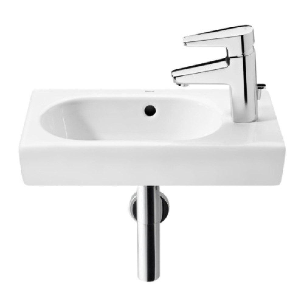 Раковина Roca Meridian-N 327248000 45 см – очень компактная, глубиной всего 25 см и высотой 14 см. Смеситель устанавливается сбоку, для него предусмотрено одно отверстие. Рукомойник сделан из санитарного фарфора, он белый, без декоративных элементов. Чаша прямоугольная, но с овальной внутренней емкостью и закругленным передним бортиком. Слив располагается по центру, есть перелив на задней стенке. Раковина крепится к стене, устанавливается отдельно от мебели и без пьедестала. Крепеж входит в комплект.