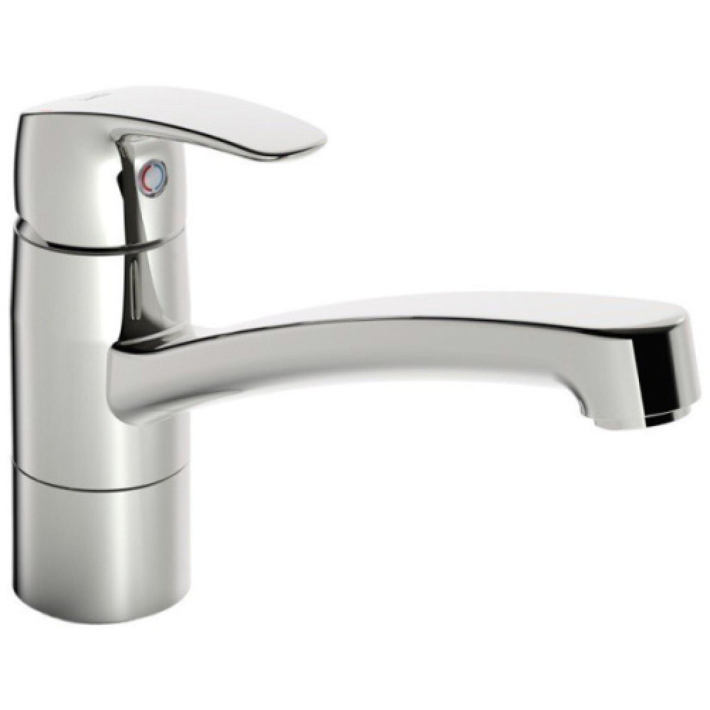Смеситель для кухни c поворотным изливом. Угол поворота излива 100º (заводская установка), может быть изменен. Двухкомпонентная прочная рукоятка обеспечивает удобство использования. Встроенные опции ограничения температуры и напора воды.