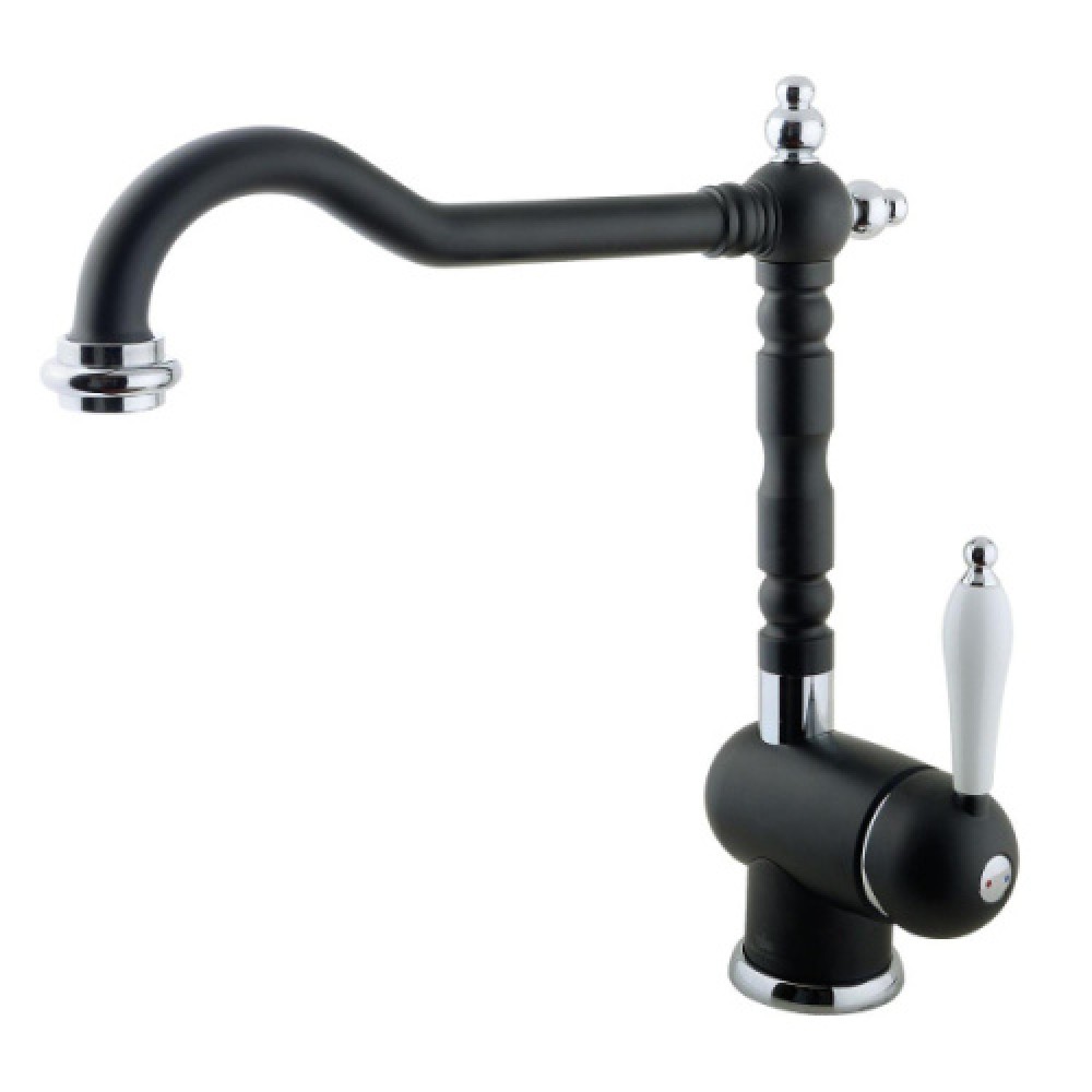 Смеситель для кухни Timo Morea 2406F – изящная, стилизованная под старину модель с однорычажным управлением. Излив – длинный (27,5 см), слегка изогнутый, поворотный. Керамическая ручка расположена сбоку. Корпус производится из латуни с покрытием в нескольких расцветках: бронза, шампань, жасмин, антрацит, хром, сэнди (песочный), черный и белый. Поверхность может быть глянцевой или матовой. Модель предназначена для раковины на оформленной в ретро-стилистике кухне. Монтируется в одно отверстие на мойку или столешницу.